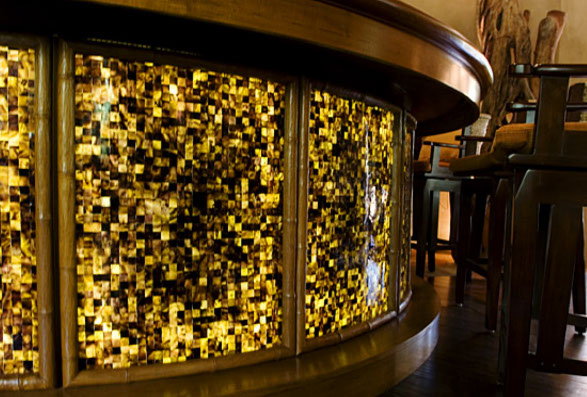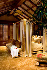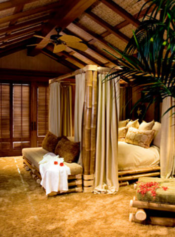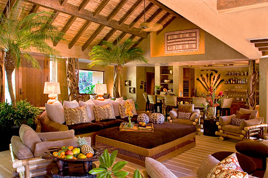 Indoor-outdoor living with an authentic island feel. Fallen logs from the rainforest have been repurposed as interior and exterior columns, setting off a fountain nestled in an organically designed landscape. The rockery fireplace is opened on two sides, enhanced by custom-made oversized Indonesian furniture and artifacts, and a backlit shellstone bar.